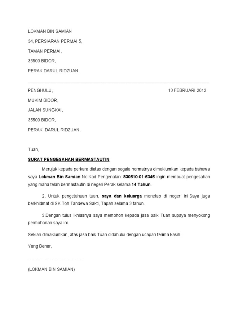 Contoh surat pengesahan bermastautin dari ketua kampung. Dengan segala hormat dan. Web Surat pengesahan mastautin terkini bagi pemohon yang kelahiran luar Negeri Terengganu dan telah bermastautin di Negeri Terengganu tidak kurang dari tiga 3 tahun berturut-turut.