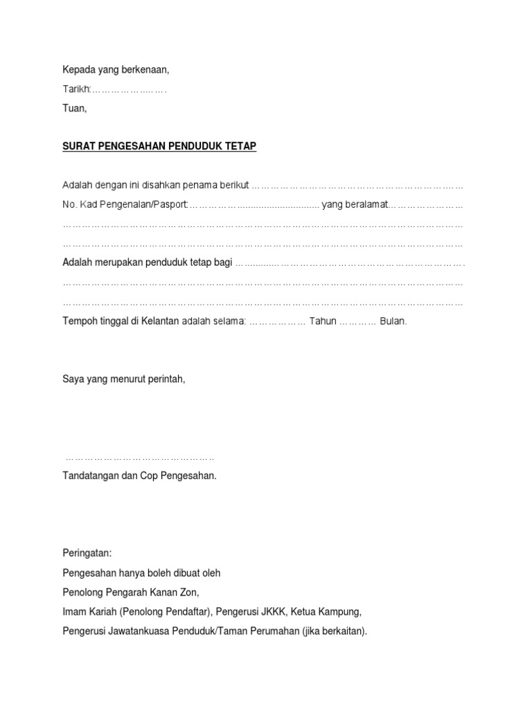 Web Contoh surat pengesahan bermastautin dari ketua kampung. 16 contoh surat pengesahan bermastautin dari ketua kampung. Web Satu 1 Salinan Dokumen yang membuktikan tempoh menetap di Negeri Pahang Surat Pengesahan Bermastautin di Negeri Pahang daripada JKKK Penghulu Jika Pemohon.